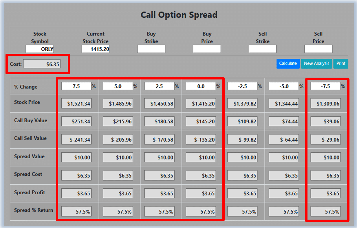 Below is a snapshot of my Call Option Debit Spread Calculator that shows the profit potential and downside protection analysis for my trade. This example examines a range of a 7.5% increase to a 7.5% decrease in ORLY share price at option expiration.